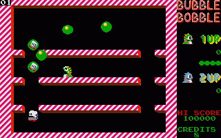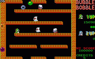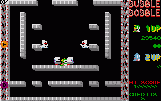 Taito’s classic arcade features brilliant gameplay beats of jumping, collecting, trapping and popping enemies (which to be honest, if  that was all this game had to offer, would still make Bubble Bobble one of the best platformers available on the ST) there are myriad different hidden details waiting to surprise players. Hard to reach areas become accessible to those who jump on their own bubbles and learning the huge variety of pickups and what they do is a treat. At first, power up appearances seem random, but actually everything that happens in this game is controlled by what the players are doing, or what they did on the previous screen. Genius.